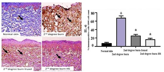 A marked expression of IL-6 within the dermal layer of the burn group, as indicated upon calculation of the % immunopositive cells/1000 counted cell was clearly displayed. While the treated groups with either Iruxol or HS showed a marked decrease in the expression of IL-6 (Figure 4).