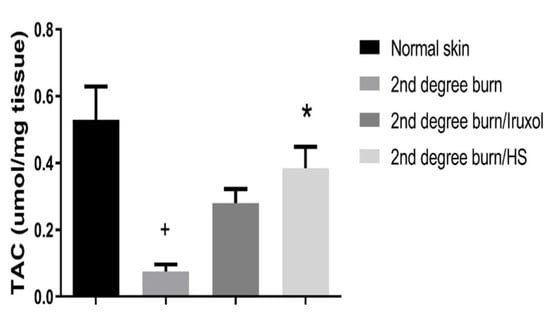 Effect of HS on total antioxidant capacity (TAC). TAC: Total antioxidant capacity; HS: Hibiscus sabdariffa; +, (p < 0.05) vs. normal group; *, (p < 0.05) vs. 2nd degree burn group. Differences between groups were examined by ANOVA/Tukey-Kramer’s multiple comparison test. n = 6.
