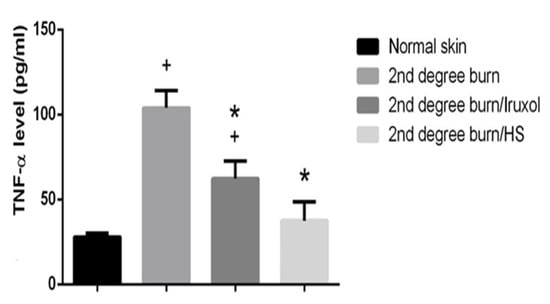 The burn group showed a significant increase in the levels of TNF-α (p < 0.05) compared to the normal group. The Iruxol- or HS-treated group of rats exhibited a significant decrease in TNF-α level (p < 0.05) compared to the burn group (Figure 6).