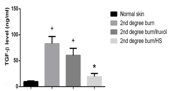 The burn group showed a significantly increased level of TGF-β compared to the normal group. The Iruxol-treated group showed non-significant changes in the level of TGF-β compared to that of the burn. However, the HS-treated group showed a significant decrease in those levels compared to the burn group (p < 0.05) (Figure 7).