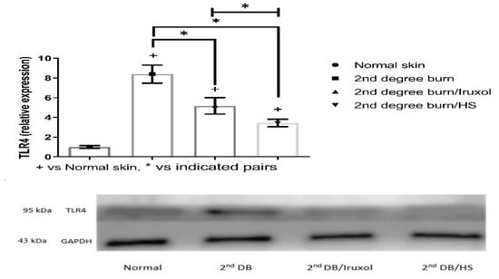 The burn group showed a significant (p < 0.05) increase (8- fold) in the relative expression of TLR4 compared with that of the normal group. The Iruxol- or HS-treated groups showed that TLR4 expression was significantly decreased (p < 0.05) compared to the burn group. However, the HS-treated group exhibited a significant decrease (p < 0.05) in the expression of TLR4 compared to that of the Iruxol-treated group (Figure 8).
