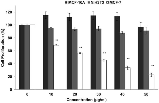 Antiproliferative effect of RTEAL on breast cancer cell line. MCF-7, MCF-10A and NIH3T3 cells were treated with RTEAL at the concentrations as indicated for 72 h. The assay was performed using MTT reagent. Data were presented as mean ± SEM of the three independent experiments with triplicate for each treatment. Asterisks indicate a significant difference (** p < 0.01) for each concentration was compared to the control cells.