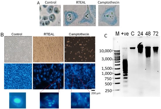 RTEAL-treated cells demonstrated noticeable morphological changes such as nuclear fragmentation, chromatin condensation and appearance of intense DAPI-stained micronuclei (Figure 2A,B) when compared to untreated cells (control). These features were also observed in camptothecin-treated cells. In Figure 2C, a smear of high molecular weight (HMW) DNA was detected in cells treated with RTEAL for 24, 48 and 72 h, but not in the control sample. Nevertheless, we did see the formation of the DNA ladder in cells treated with camptothecin.