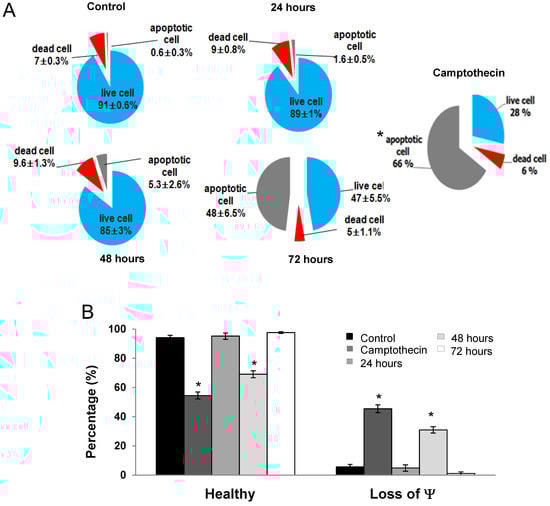 RTEAL induces apoptosis and mitochondrial dysfunction. Cells were treated with RTEAL at 28 µg/mL for up to 72 h. (A) Distribution of apoptotic and dead cells. (B) Loss of mitochondrial membrane potential (Ψ). Data were presented as mean ± SEM of the three independent experiments. Asterisks indicate a significant difference (* p < 0.05) for each treatment was compared to the control cells.