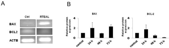 RTEAL alters the mRNA and protein expression of BCL-2 and BAX. MCF-7 cells were treated with 28 µg/mL of RTEAL for 24, 48 and 72 h. (A) RT-PCR results of cells treated for 72 h. (B) The relative protein expression was quantified after normalizing with β-tubulin and presented as mean ± SEM from three independent experiments.