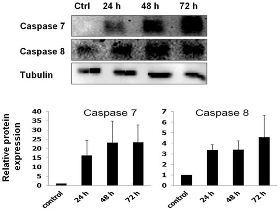 Annexin V/PI analysis revealed that RTEAL induces apoptosis in a time-dependent manner. A remarkable increase of apoptotic cells from 1.6% (24 h) to 48% (72 h) was observed in RTEAL-treated cells when compared to control (Figure 3A). However, the involvement of non-apoptotic cell death is also possible as there was a noticeable increase in dead cells after treatment. In addition, MCF-7 cells treated with RTEAL (31 ± 1.18%) showed a significant decrease in mitochondrial membrane potential at 48 h (Figure 3B). The number of cells with mitochondrial defect decreased when the treatment was prolonged to 72 h. We also noticed an increase in BAX expression, which accompanied by a concomitant decrease in BCL-2 expression (Figure 4). The protein expressions of caspase 7 and 8 were also upregulated upon treatments when compared to the control (Figure 5).