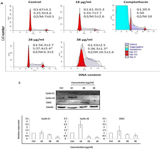 As depicted in Figure 6, cell cycle progression was perturbed at the S or G2/M phase depending on the concentration and duration of RTEAL treatment. Cells treated with different concentrations exhibited a significant cell arrest at the S phase, although the extent of perturbation is not apparent with the increased concentration. However, an increase of cell cycle arrest at G2/M and cell debris was noticeable at the concentration of 38 µg/mL (Figure 6A). As shown by Western blot results, cell cycle arrest was evidenced with the dysregulation of cell cycle regulators. The decrease of cyclin E1 and A2 was concentration-dependent but not for CDK2 (Figure 6B). The expression of cyclin A2 was downregulated from 28 µg/mL onward, while a decrease of cyclin E1 was only observed at 38 µg/mL. For the time-course treatment, the appearance of apoptotic sub-population before G1 phase was only detected at 48 h when cells were treated with 18 µg/mL of RTEAL (Figure 7). When the duration of treatment was prolonged to 72 h, more cells arrested at S phase when compared to the control. The cell cycle arrest after RTEAL treatment was also found to be time-course dependent.