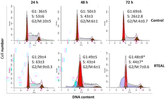 Time-dependent alteration in the cell cycle progression. MCF-7 cells were treated with 28 µg/mL of RTEAL for 24, 48 and 72 h. Data were presented as mean ± SEM of the three independent experiments. Asterisks indicate a significant difference (* p < 0.05) for each treatment was compared to the control cells.