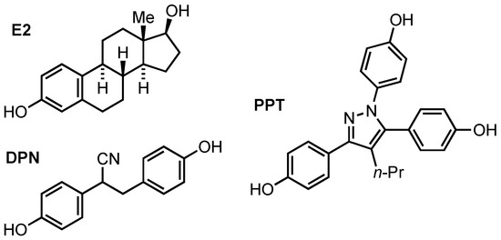 Structures of 17β-estradiol (E2), ERα-selective agonist 1,3,5-tris(4-hydroxyphenyl)-4-propyl-1H-pyrazole (PPT), and ERβ-selective agonist 2,3-bis(4-hydroxyphenyl)propionitrile (DPN).