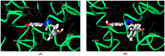Docked structures of 1-(4-hydroxyphenyl)-α-phenyl-1,2,3-triazole-4-ethanol (21) in the binding pocket of agonist mode human ERβ (pdb code 2jj3): (a) (R) stereoisomer; (b) (S) stereoisomer.