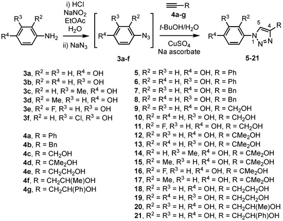 Synthesis of (1,4-disubstituted)-1,2,3-triazoles 5–21.