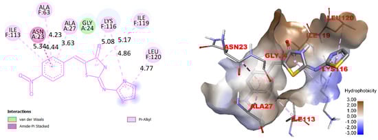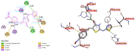 The 4-thiazolidinone derivative Les-6222 forms two hydrogen bonds with Arg596 and His367 with lengths of 2.85 Å and 2.12 Å, respectively. All three molecule cycles are connected to the number of lipophilic amino acids via the different types of hydrophobic non-covalent interactions of 5-LOX, as shown in Figure 2.
