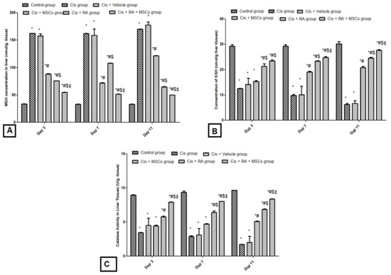 3.2. Effect of BM-MSCs and RA and Combination of Both on Oxidative Stress Markers (GSH, CAT and MDA) in Cis-Induced Hepatotoxicity
