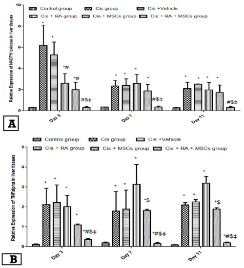 3.3. Effect of BM-MSCs and RA and Combination of Both on NADPH Oxidase and TNF-α Expression in Cis-Induced Hepatotoxicity