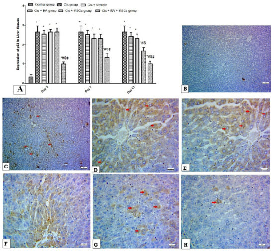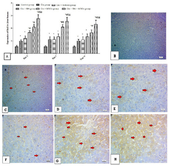 3.5. Effect of BM-MSCs and RA and Combination of Both on Apoptotic Markers (Caspase-3, p53 and Bcl2) in Cis-Induced Hepatotoxicity