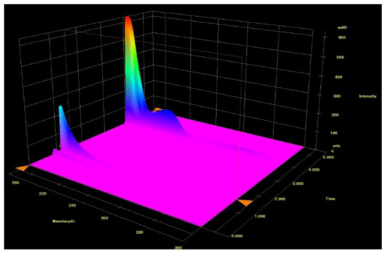 High resolution PDA detector full 3-D chromatogram confirms the identity of peaks with implying certain extent of confidence in peak recognition and measuring, with easily recognized characteristic UV-Abs spectrum of meldonium, annotated with marking triangle located at the axis presenting retention time.