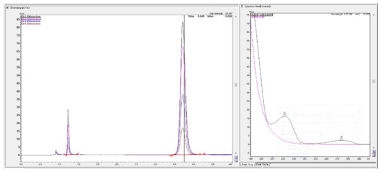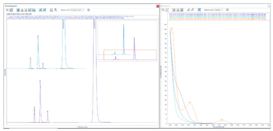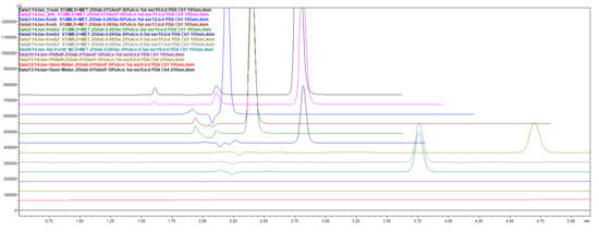 This column confirms the applicability of 125 mm column, by generating chromatograms with doubled run times of analytes. Figure 9 was 15-wavelenths channels monitored chromatogram of 250 × 4 mm LiChrospher CN column under identical operating HPLC parameters as previous 125 × 4 mm column. The extracted Abs-spectrum on right side are from meldonium (black) and first eluted adjacent unknown peak (pink) for confirmation of their distinction, recognition with the aim of the run time and spectral shapes.