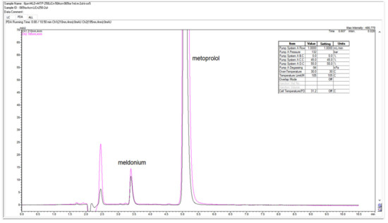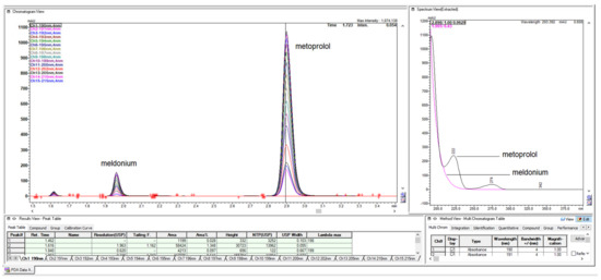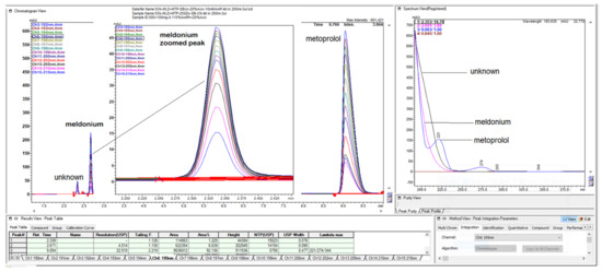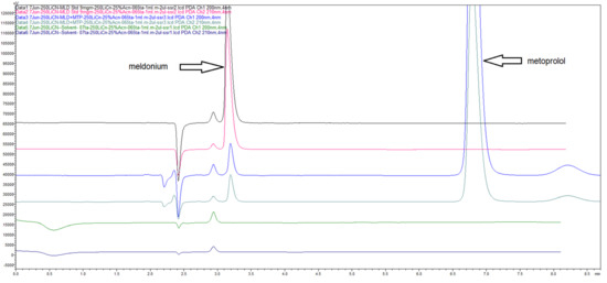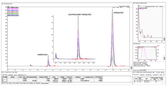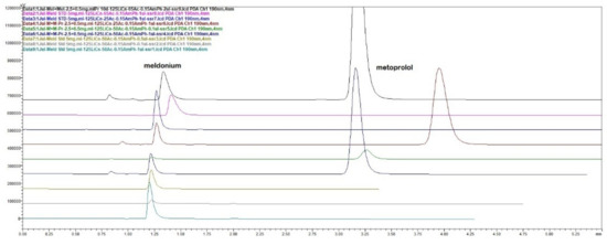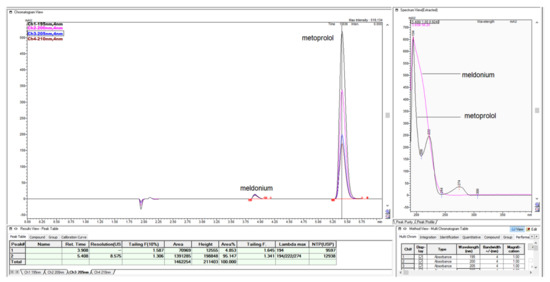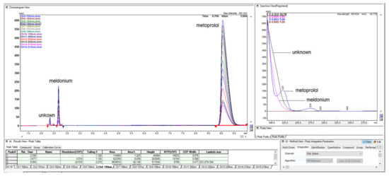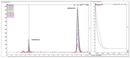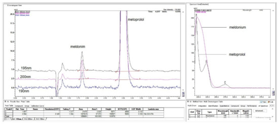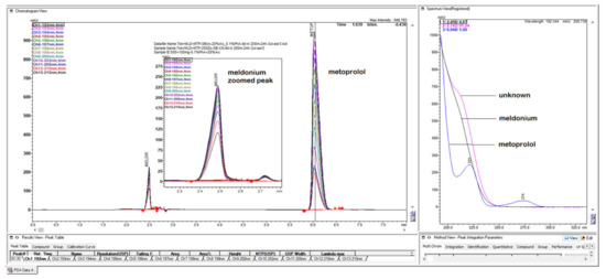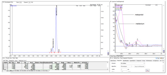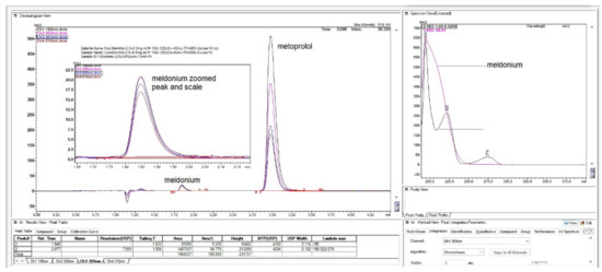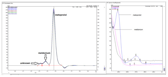 Chromatograms with first peak with 1.25 min of meldonium with its concave UV spectrum was overlaid with metoprolol spectrum, from the bigger peak eluted second at 4 min.