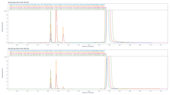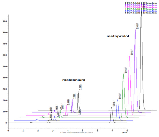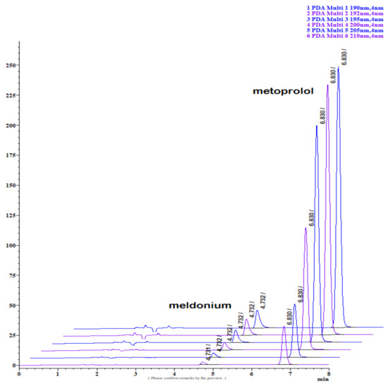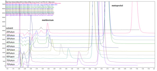 The dependence of peak size and shape of meldonium and metoprolol at 4-different wavelengths was illustrated overlaid at 4 wavelengths with isolated peak analytes UV spectrum, the “concave” shaped of meldonium and double-apex shaped of metoprolol, shown in Figure 4. Figure 5 illustrates 15-channels extraction, 15 wavelengths calculated changes of chromatogram with both analytes, with the aim to get the full conclusion about sensitivity power of the method for both peaks. Search for limits of variation of mobile phase composition with the shape of chromatogram and peaks, as retention time mapping and peak asymmetries were presented on overlaid set of chromatograms on Figure 6, with a 25%, 50% and 60% increase of ACN.