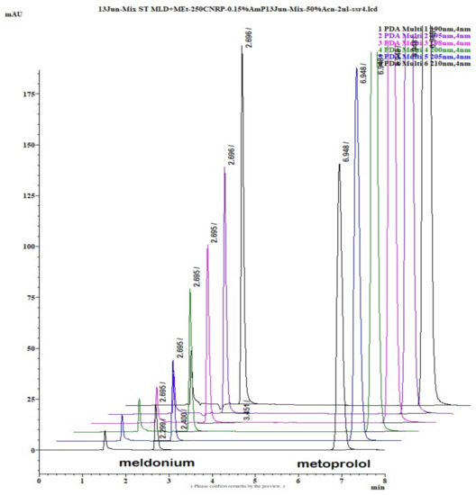Chromatograms, performed with diluted acids, without use of phosphate salts. The first choice was 0.1% v/v o-H3PO4 80% and 20% ACN, recorded and overlaid at 13-different UV-wavelengths N- 20%ACN-80% 0.1% o-H3PO4. Distorted peaks with leading of meldonium and tailing of metoprolol were, for the first time, clearly visible.