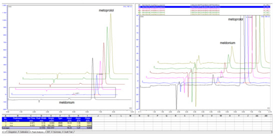 Overlaid chromatograms for linearity of peak responses to concentrations for meldonium and metoprolol with the short 125 × 4 mm LiChrospher column.