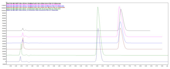 Third concept was based on Zorbax CN-SB 250 × 4.6 mm 5 µm column. This column was most tested and exploited since its chemistry permits and prefer medium to highly acidic mobile phase, according to manufacturer specifications. Beside this feature, this column generates the highest number of theoretical plates, which means that the highest efficiency should be created for separated peaks. The perfect symmetry of meldonium was in direct visible comparison highly superior to peak of metoprolol, which imputes, suggest change of mobile phase. When the organic solvent was increased to 50%, significant chromatogram shape difference appeared, illustrated on Figure 28. This mobile phase yielded perfect shaped symmetric peak of meldonium (tailing F = 1.31) and metoprolol (tailing F = 1.36), within an overall run time of less than 3.5 min. This concept, set of experimental chromatographic conditions of mobile phase and separating column, created the shortest run time effective method for the determination of meldonium and metoprolol in pharmaceutical dosage forms. Further increases in the percentage of organic solvent ACN in mobile phase to 60% with 40% 13 mM NH4H2PO4, shown in Figure 30, does not significantly change the chromatogram with retention times of components, except some of worsening the peak symmetry of meldonium, with shortening of the run time to below 3 min. Acidification of mobile phase with NH4H2PO4 to pH = 2.5 manifests some deformation, peak leading, skewing of peak of meldonium, compared with not the treated solution of the buffer salt in mobile phase. In a further research work, we tested the applicability and selectivity of so far the shortest HPLC method, with applying of samples which were kept on room temperatures 24–72 h, for checking of possibility for appearance and separation and determination of first degrading products. These experiments were performed on other HPLC system Agilent 1260-II with PDA detector with flow cell volume of 1 µL, and decrease flow rate to F = 1 mL/min, so run time increased to about 3.6 min. In varying from 30% to 50% ACN in eluent, retention of meldonium was changed by about 10%, while metoprolol retention was doubled in value. The percentages of ACN in mobile phases were labelled on the right on each chromatogram. A further figure illustrates the samples with constant concentrations of analytes adjusted to meldonium 2.5 mg/mL and metoprolol 0.5 mg/mL in mobile phase, and during testing and experimental work, samples were kept at room temperature for 3 days and injected. Monitored at two different overlaid UV-wavelengths, the chromatograms showed additional peaks which confirm the possibility of this method to register and measure new-born peaks as a degrading product. The following chromatograms performed on Zorbax CN-SB 250 × 4.6mm, recorded and overlaid at 2-channels of 195 nm and 205 nm overlaid are on left and their characteristic UV-spectrums on the right. With mobile phase composed of 50% ACN and 50% 13 mM NH4H2PO4, the most effective separation was achieved in less than 4 min run time. The second peak was meldonium on chromatogram, and the last highest peak was metoprolol, third and fourth peak newly appeared. From the 4 presented UV-Abs spectrums, the second from top was of meldonium peak extracted and fourth at the bottom was of metoprolol. Figure 38 contains overlay of fresh sample of meldonium and metoprolol standards, and they lack the second and third peaks of meldonium degradation products, while other present samples were prepared and kept at room temperature for 3 days, they have second and third peak with UV-spectrums similar to meldonium, set of overlaid presentation at 2-different UV-wavelengths, 195 and 205 nm. The third early degradation product was easily noticeable with improved resolution and extended run time. The set was performed with intended increasing different injection volumes, for checking of influence of compound quantity on peak shapes. The first peak was meldonium, whilst the second and third which were absent in fresh standards of meldonium and last eluting highest peak of metoprolol.