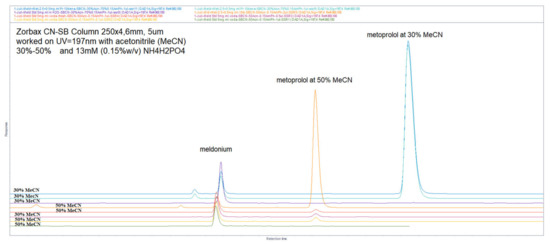 Chromatograms, obtained for use in CN-cyano column, Zorbax CN-SB 250 × 4.6 mm for simultaneous determination of meldonium with metoprolol. Numerous combinations of ACN with 0.15% NH4H2PO4 have been presented overlaid at 195 nm and 200 nm, compared with the last two chromatograms on the bottom, which are made of on 100 × 4 mm C18 Xterra column with 10% ACN and not eluting metoprolol even to 20 min.