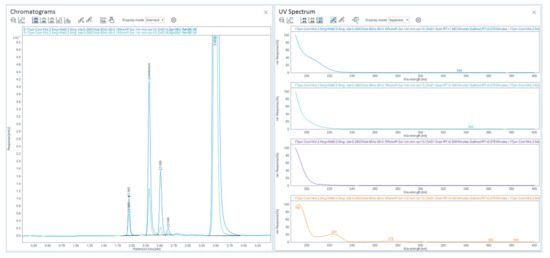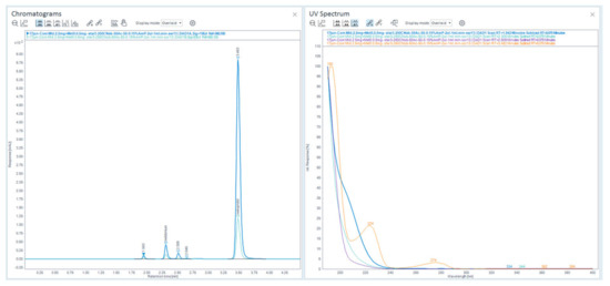 Chromatograms, obtained by usage mobile phase composed of 70% ACN and 30% 0.07% v/v TFA, with exceptionally short run times lasting less than 3 min, with perfect shaped all peaks, but with no impressible resolution between them. UV spectrum extracted peaks on the right.