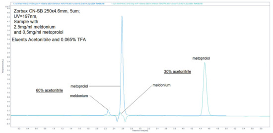 The following supporting information can be downloaded at: https://www.mdpi.com/article/10.3390/scipharm90040065/s1. Figure S1: Testing the chromatograms elution positions and peak shapes of meldonium and metoprolol samples and meldonium standards only, in mobile phases with different procents of ACN and diluted TFA. Figure S2: Chromatogram gained with Zorbax CN-SB column with 3 clearly separated API molecules meldonium, metoprolol and bisoprolol, with their UV-absorption characteristic extracted spectrums on right side, which expand the applicability of method to perform determination of other beta-blocker drugs simultaneously.