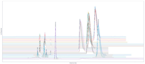 Overlaid chromatograms of LiChrospher CN 250 × 4 mm column experiments, that were useful for rough and fine tuning of analyte peaks according to presence of other compounds. Peaks mapping as a function of acetonitrile percentage in eluents, in the range of 25–70% ACN.