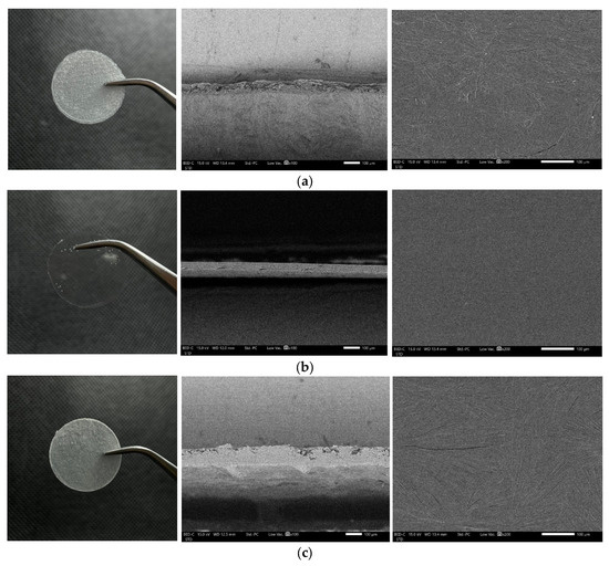 The surface and cross-section structure of the ODFs were investigated by scanning electron microscopy (SEM) with a JEOL scanning electron microscope (JSM-5410LV, JEOL, Ltd., Peabody, MA, USA) at 10 kV under the low-vacuum mode. The surface and cross-section were observed without coating at magnifications of 200× and 100×, respectively.