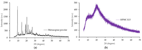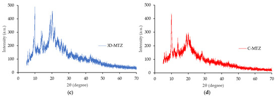 The diffractograms of the MTZ powder, HPMC E15, 3D-MTZ, and C-MTZ are shown in Figure 5. The diffractogram of the mirtazapine powder shows some peaks at 9.25, 14.39, 18.57, 19.24, 20.38, 21.81, 23.68, 25.86, 26.77, etc. (Figure 5a). These peaks indicate the crystalline form of the drug and were also found in Naureen et al. [18]. Controversially, the diffractogram of the HPMC E15 shows an amorphous pattern, without any peaks of crystalline structure (Figure 5b). The diffractograms of the 3D-MTZ and C-MTZ show a mixed pattern between the MTZ powder and the HPMC E15. Furthermore, some specific peaks, such as the peaks at 19.25 and 26.77 2θ, disappeared. This result indicates that the crystalline structure of the drug partially converted to an amorphous state. When a solvent evaporates, the drug dispersed in a polymeric carrier can change to an amorphous form [30,31]. In other words, the 3D-printing and casting, involving solvent evaporation, could reduce the drug’s crystallization [32]. In addition, the remaining drug crystals appeared on the ODFs surface, as observed in the SEM micrographs.