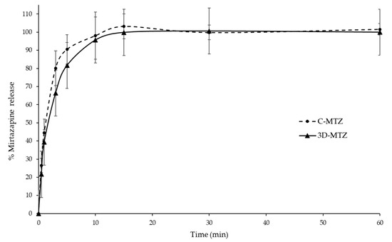 According to USP 43 NF38, the drug release profile of MTZ must be performed in 1 N HCl because the MTZ is normally absorbed in the stomach. The MTZ release profile is shown in Figure 6. Overall, the percentage of drug release of the 3D-MTZ was not significantly different from the C-MTZ (p > 0.05), although the 3D-MTZ had a faster disintegration time than the C-MTZ. Both the 3D-MTZ and C-MTZ released the drug rapidly and by more than 80% in 5 min, then gradually released to around 95% at 10 min. Another study found that MTZ disintegrating tablets showed an 85% drug release in 1 N HCl at 15 min [36]. The MTZ–HPMC interaction may be involved with the drug release. The possible interaction between the MTZ and HPMC is the hydrogen bonding (N+-H⋯O bonds). In a polar environment, hydrogen bonds are weak and can be broken easily, due to the disturbance of the water molecule. Furthermore, the O atom of the water molecule could competitively form a hydrogen bond with the N atom of the mirtazapine molecule [37]. Thus, the ODFs in our study showed a faster drug release and potential to be used as an orally fast-disintegrating formulation. Another reason to explain the rapid drug release is the nature of crystalline structures. The mirtazapine crystals in the 3D-MTZ and C-MTZ partially convert to an amorphous state that might increase the water solubility of the mirtazapine. This study indicated that the 3D printing and casting produced ODFs with a rapid drug release.