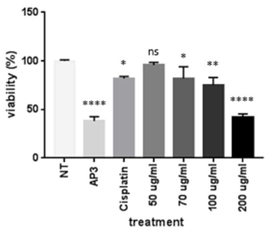 The CCK test was carried out according to the manual of the CCK-8 Kit (Abbkine, Hubei, China). A quantity of 1.5 × 104 A-549 cells/100 mL was grown on a culture test 96-well plate (Greiner, Frickenhausen, Germany). Cells were incubated for 24 h, then divided into five groups, including the non-treated group (NT); AP3 80 µg/mL; ethanol extract of Ocimum sanctum Linn. (EEOS) at 50, 70, 100, or 200 g/mL; and cisplatin 9 g/mL. Each treatment was replicated three times. The treatments were incubated for 24 h, then 100 mL of water-soluble tetrazolium (WST-8) reagent was added to each sample and incubated for 4 h (in the dark). Then, the reaction was stopped by adding 100 mL/well of DMSO (Santa Cruz Biotechnology, Dallas, TX, USA). The results were read using an ELISA Reader (BioRad, Hercules, CA, USA) at a wavelength (λ) of 460 nm. The absorbance results obtained were then calculated using the following formula to obtain the percentage of viability.