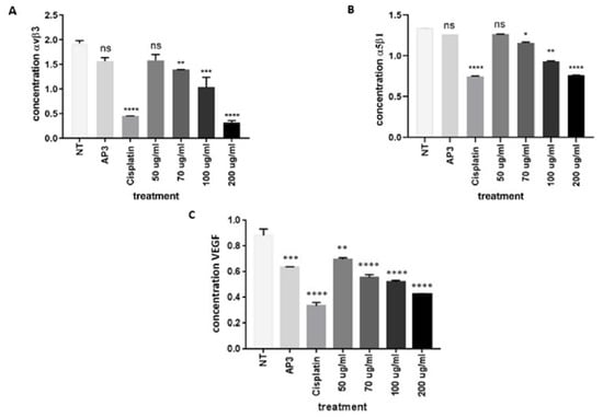 To strengthen the evidence regarding the effect of EEOS on cell migration, we performed ELISA on A549 cell lysates. The representative parameters observed were integrin αvβ3, integrin α5β1, and VEGF. The untreated A549 cells produced the highest concentration of integrin αvβ3, integrin α5β1, and VEGF. Additional treatment of A549 with EEOS diminished the integrin αvβ3, integrin α5β1, and VEGF concentrations in a dose-dependent manner. The integrin αvβ3 (Figure 3A), integrin α5β1 (Figure 3B), and VEGF (Figure 3C) concentrations were significantly suppressed under the optimum concentration of EEOS (200 µg/mL) and under cisplatin.