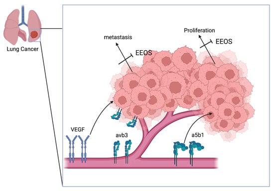 In addition to integrin expression, VEGF expression has been confirmed to be a critical pathological factor in the occurrence of NSCLC by increasing vascular permeability and increasing angiogenesis [29]. This study confirmed that EEOS has the ability to inhibit A549 cell angiogenesis by inhibiting tube formation, as shown through the angiogenesis assay [9] and reducing VEGF concentrations. During angiogenesis, VEGF has an associated mechanism with integrins, as integrins are overexpressed on the endothelial cell surface to facilitate the growth and survival of new vessels [25]. The supply of oxygen and nutrients to cells through blood vessels is the most important aspect in the survival of cells, including cancer cells. Vascular endothelial growth factor (VEGF) is a homodimeric glycoprotein from the endothelial growth factor family and is an important factor in the formation and regulation of angiogenesis processes [30]; in addition, VEGF has biological roles in the regulation of vascular permeability, metabolism, immune system, inflammation, and neurological function [31]. Tumors can generate their own vascular system. VEGF acts as an angiogenic factor by promoting their proliferation, migration, adhesion, and survival. VEGF may, thus, play a role in vascular invasion [32]. Furthermore, VEGF also play role in targeting other cells in the tumor microenvironment, as well as initiating the function of growth factors and integrin, mainly svb3 and a5b1 [33,34,35]. In recent years, the inhibition expression of VEGF has been utilized in tumor-targeted therapy [34].