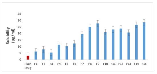 Plain Tel solubility was 2.93 µg/mL. As shown in Table 1 and Figure 3, all Tel-SSDs showed enhanced solubility compared to the plain Tel. P-SSDs containing hydrophilic polymers showed higher solubility than that containing superdisintegrants. They showed nearly fourfold increase in Tel solubility whereas P-SSDs containing superdisintegrants showed approximately two-fold increase. On the other hand, all C-SSDs showed very high solubility. The highest solubility was recorded with formula F15 with 28.52 µg/mL that is 9.7 ≈ 10 folds higher than the plain Tel. It was clear that the deposition of Tel on the surface of an inert carrier changed its nature into a more amorphous structure. Additionally, the solubilizing and wetting effect of hydrophilic carriers, as well as the effect of superdisintegrants in reducing particle size of the drug, had a clear, pertinent effect on Tel solubility.