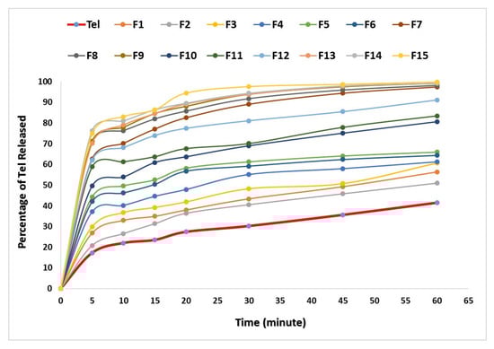 Finally, by analyzing and interpreting different dissolution parameters, it was clear that formulae F15 and F14 delivered the highest enhancement effect on Tel dissolution and release rates.