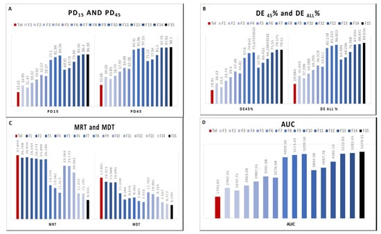As seen in Table 6 and Figure 5, formula F15 and F14 had the highest average percent of drug dissolved PD15, PD45, the largest AUC, the lowest MRT and MDT with the highest DE45% as well as DEall%.