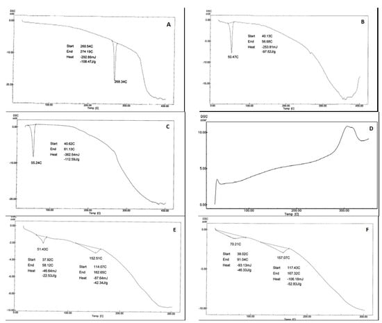 Figure 6. Differential scanning calorimetry of (A) Tel, (B) PEG 4000, (C) Poloxamer 407, (D) CCS, (E) F14, (F) F15.