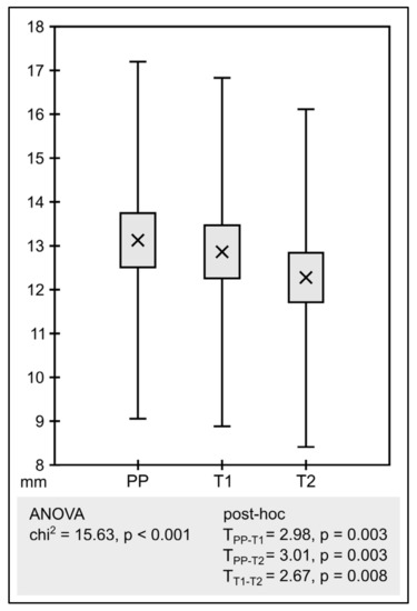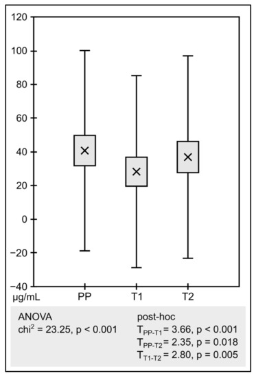 Analysis of inhibition zone diameters (PP—pure powder, T1—tablet 1, T2—tablet 2). The graph compares the mean of the determinations. The boxes show standard error and the whiskers shows standard deviation.