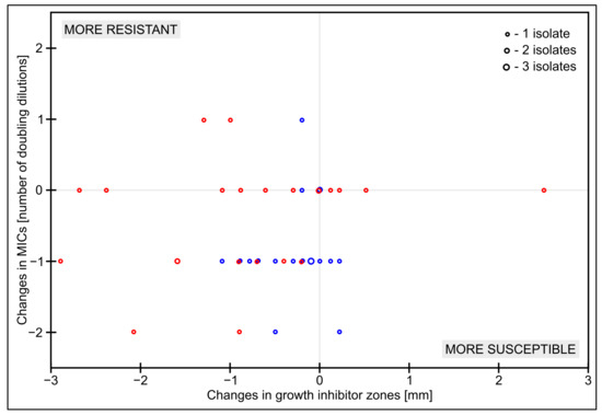 Scatterplot of changes in MICs and inhibition diameter zones depending on the source of the substance tested (blue—tablet 1, red—tablet 2) against the reference method with pure powder.