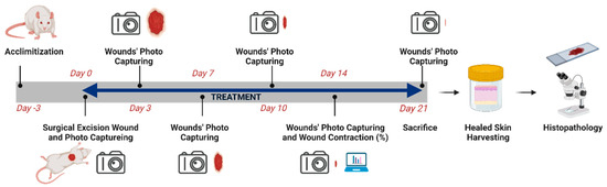 An excision wound model was used to monitor wound contraction and wound closure time. Animals in each group were anesthetized, and the back hair of the rats was depilated using an electrical shaving machine. The wounds (2 × 2 cm; 400 mm2) were created on the dorsal region of each animal by excising the skin surgically. The animals were weighed every 3–4 days. The wounds were then cleaned with 10% iodine and left open without any dressing. The tested extracts, reference drugs, and vehicles were applied topically once daily until the wounds had completely healed. The progressive changes in the wound area were monitored by capturing photos using a Canon ELPH 100 HS camera (Canon, Tokyo, Japan) on the following days: 0, 3rd, 7th, 10th, 14th and 21st. Using ImageJ software (US National Institutes of Health (NIH), Bethesda, MD, USA), and the wound area was calculated. Wound contraction was calculated as the percentage of the reduction in the wounded area using the following equation: