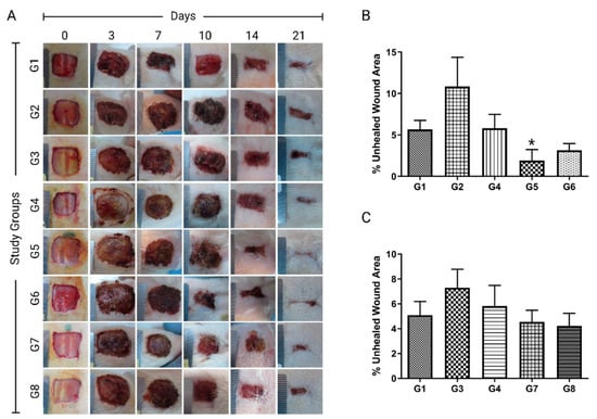 Photographs of wounds and their respective unhealed wound area percentage by different treatment groups (A). Negative control (G1), petroleum jelly (G2), olive oil (G3), MEBO (G4), 5% H. triquetrifolium ointment (G5), 10% H. triquetrifolium ointment (G6), 100 mg/L H. triquetrifolium olive oil macerate (G7), and 200 mg/L H. triquetrifolium olive oil macerate (G8). Wound photographs scales are represented in millimeters. Unhealed wound area across test groups (B,C). * Denotes for statistical significance (p ≤ 0.05) compared to the corresponding vehicle.