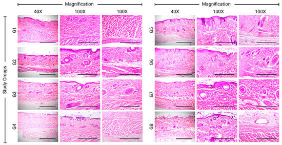 Histopathological evaluation of healed tissues by different treatment groups stained with hematoxylin and eosin (H&E) on day 21. Negative control (G1), petroleum jelly (G2), olive oil (G3), MEBO (G4), 5% H. triquetrifolium ointment (G5), 10% H. triquetrifolium ointment (G6), 100 mg/L H. triquetrifolium olive oil macerate (G7), and 200 mg/L H. triquetrifolium olive oil macerate (G8). 40× scale is 1 mm and 100× scale is 500 µm.