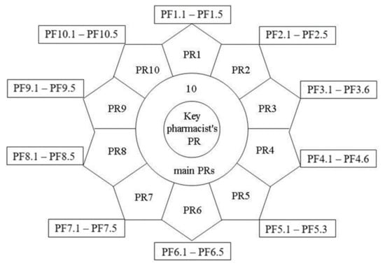 As a result of the decomposition of 10 PR of the pharmacist, we obtained a combined set of partial PFs concerning their main tasks (directions) and activities in Figure 1. The detailing took into account the principle of complexity limitation [23], the essence of which is that the obtained partial PF of the pharmacist should be legible and easy to read, and their number within the main PR should be at least three and at most six.