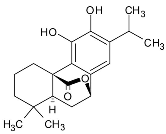 - National Center for Biotechnology Information. PubChem Compound Summary for CID 442009, Carnosol. Available online: https://pubchem.ncbi.nlm.nih.gov/compound/442009#section=3D-Conformer (accessed on 9 February 2023).