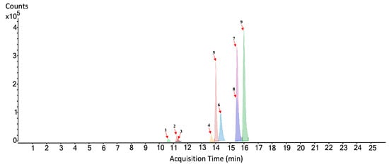 The results of the HPLC-QTOF-MS/MS analysis for the hydro-alcoholic extract of rosemary are shown in Figure 2 and Table 1. The monoisotopic mass characteristics for negative ions of the compounds were tentatively identified, and fragment spectrum results (MS/MS) are presented in Supplementary Material (Table S1). The tentative annotations belong to various compounds classes, including phenolic acids (rosmarinic acid), flavones (isorhamnetin-rutinoside and dihydroxy-dimethoxyflavone), and diterpenes (rosmanol, carnosol, and rosmadial), among others. Some ions represented by Peaks 1, 5, and 8, could not be distinguished by their masses and fragmentation profiles; however, they showed fragment ions or losses similar to other annotations, suggesting those belong to the same class of molecules.