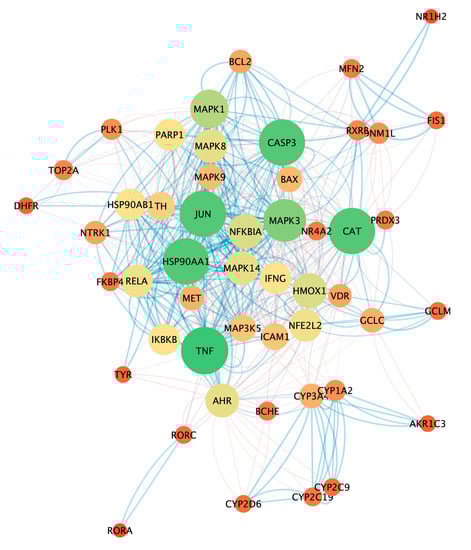 Pharmacological network for carnosol. The size and color of the circle varied with the degree value. The width and color of edges varied with the combined score.