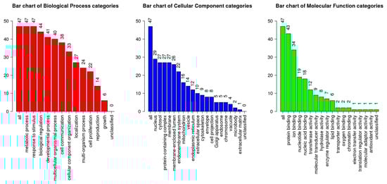 GO enrichment analysis of the identified targets to carnosol in terms of biological process (red), cellular component (violet), and molecular function (green). The bar chart shows the number of targets in each term.
